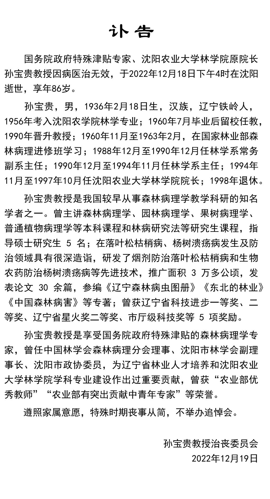 孙宝贵教授讣告