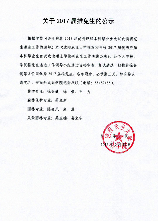 关于2017届推免生的公示