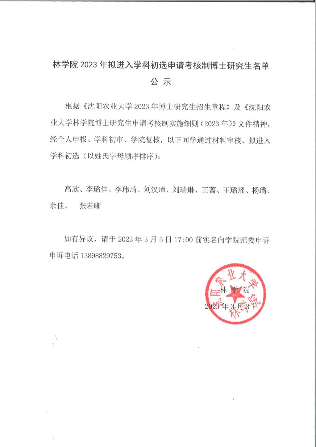 林学院2023年拟进入学科初选申请考核制博士研究生名单公示