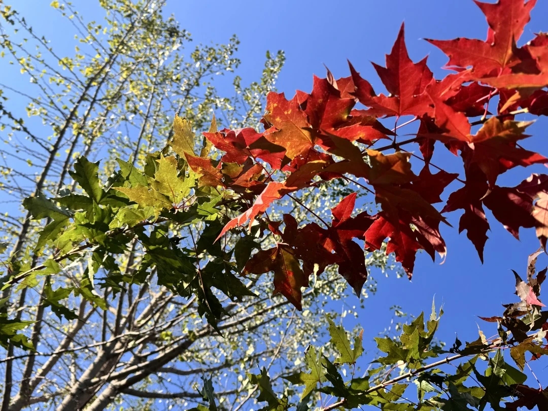 秋日悄然为我们的校园调色——红枫在湛蓝晴空的映衬下灼灼欲燃,银杏叶黄得透亮,似将整个秋天的光晖都收敛于纤细的叶脉之中。
