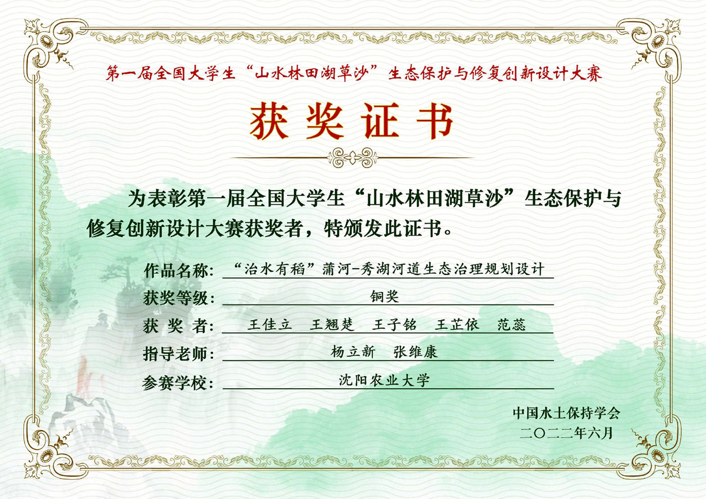 近日,在首届全国大学生“山水林田湖草沙”生态保护与修复创新设计大赛决赛中,冠军(中国)风景园林学科教师杨立新、张维康指导研究生王佳立、王翘楚、王子铭、王芷依、范蕊完成的作品斩获铜奖。