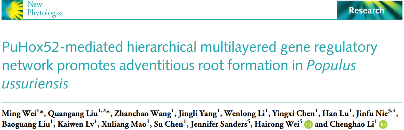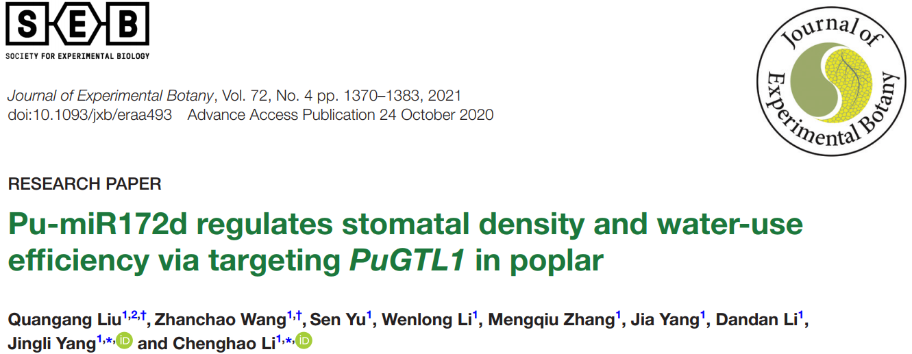 近日,刘权钢博士以第一作者和并列第一作者分别在植物学研究领域Top学术期刊Journal of Experimental Botany(植物科学一区,IF=5.908)和New Phytologist(生物学一区,IF=8.512)发表了题为题为“Pu-miR172d regulates stomatal density and water use efficiency via targeting PuGTL1 in poplar”和“PuHox52-mediated hierarchical multilayered gene regulatory network promotes adventitious root formation in Populus ussuriensis”的研究论文。