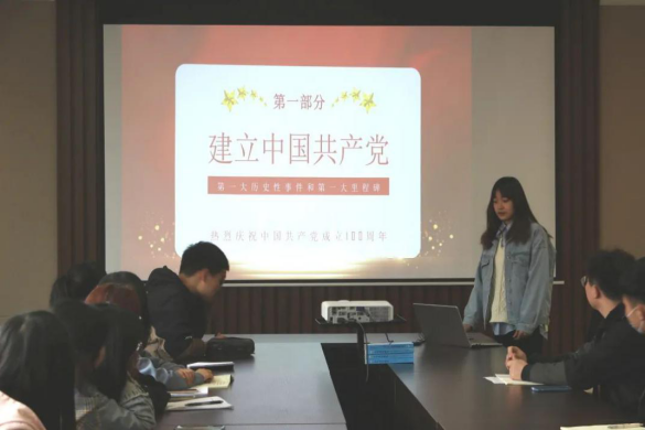 本次学习会中,李钰彤同学从中国共产党的建立、中华人民共和国的成立及推进改革开放和中国特色社会主义事业这三个方面来展开具体的党史学习,最后她希望大家能在生活中多多学习党史,学习并不断发扬党的精神。最后,胡凯老师对党史学习会进行了总结,他表示正值中国共产党成立百年的节点上,应不断推动党史学习教育往深里走、往心里走、往实里走,用实际行动为党的100周年献礼。