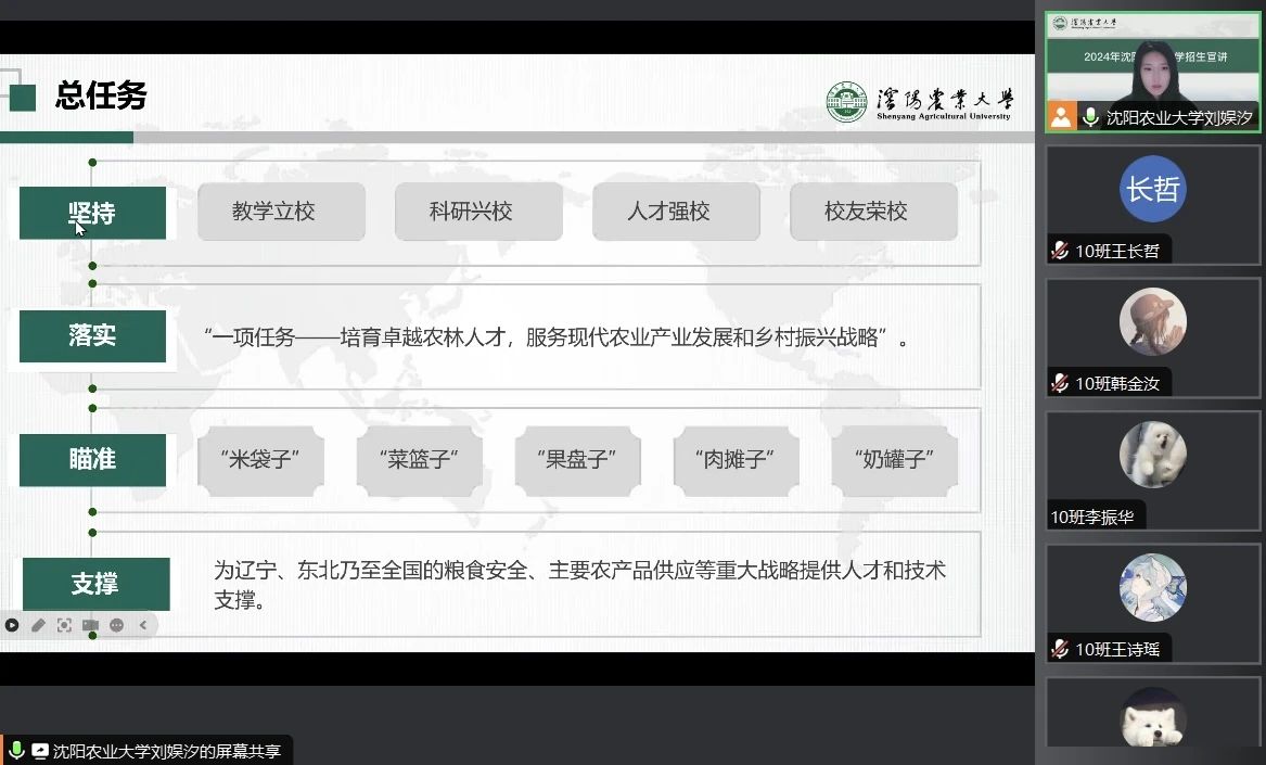 宣传使者们通过线上与线下等多种方式,全方面地向高中母校师生介绍沈阳农业大学的办学实力、校园环境、文化活动、优秀校友、发展成果等,展现学校学子风采,扩大学校的社会影响力和社会声誉,鼓励广大优秀学子报考我校,传播沈农声音,展现沈农风采。