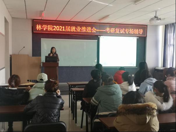 为帮助2021届考研学生充分把握录取政策,提前做好复试和调剂相关准备,3月16日中午,林学院在林学楼219举办了2021届毕业生就业推进会。本次活动邀请研究生院马晴晴老师担任主讲,林学院党委副书记杨宇老师、林学院组织员、研究生招生负责人王青娜老师、辅导员姚远老师和王秋凝老师出席了本次活动,2021届部分考研学子参加讲座。