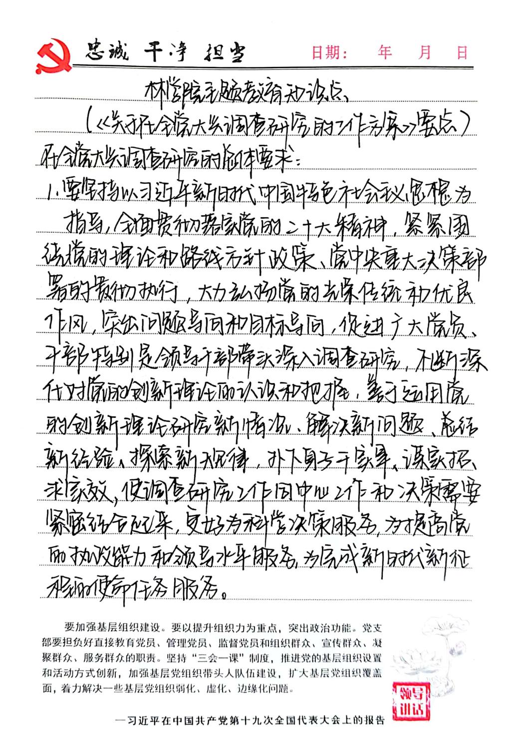 林学院主题教育已经来到了第四周,本周的主题是学习《中共中央办公厅印发〈关于在全党大兴调查研究的工作方案〉的通知》精神。让我们继续跟随师生党员在学习感悟中领略调查研究的魅力吧!